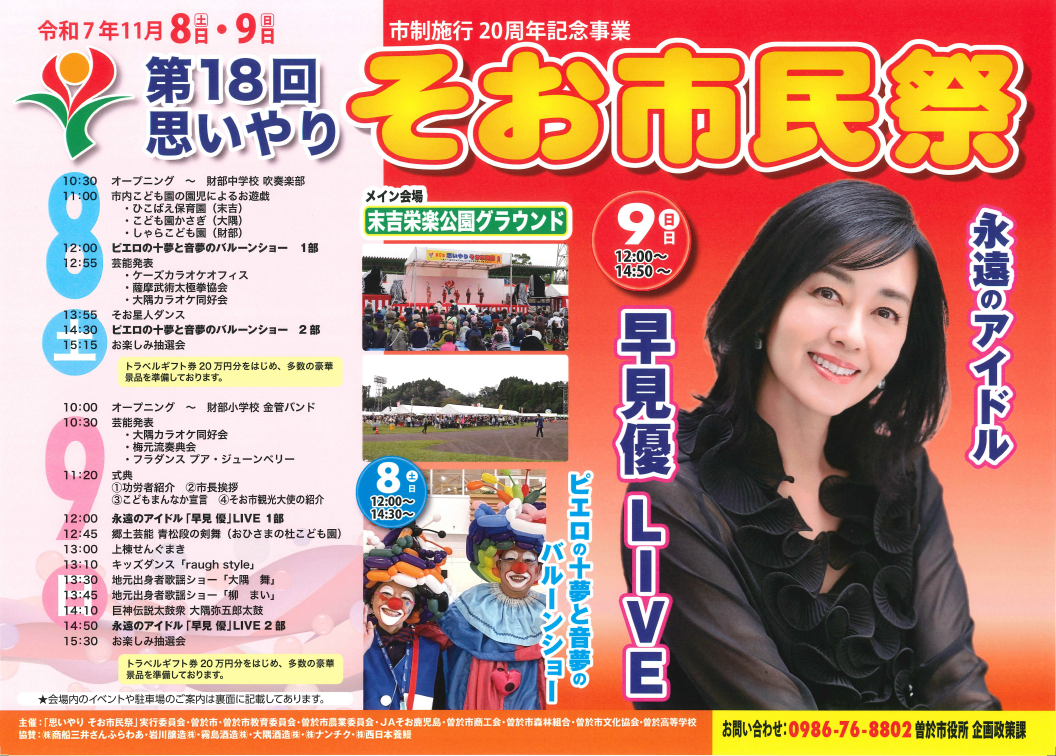 「市制施行20周年記念事業 第18回思いやりそお市民祭」の開催を予定しております。曽於市の特産品や文化・産業を存分に楽しんでいただけるよう,歌のステージ,物販・飲食ブースなど様々な催し物を準備しております。