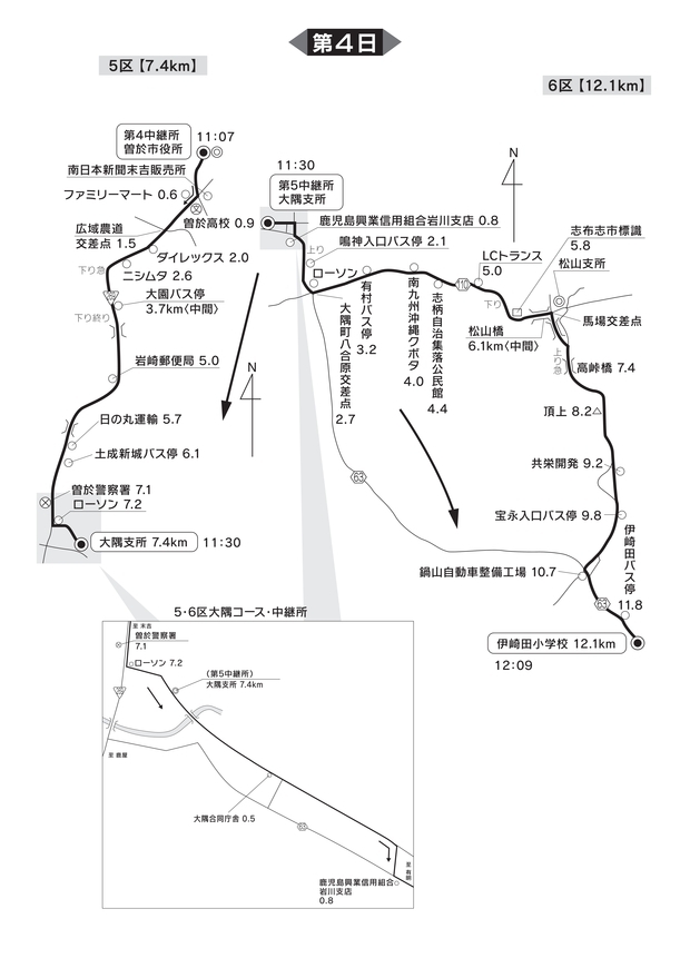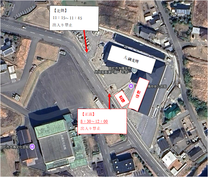 そのため、ランナー通過時間は、大隅支所への出入りを禁止します。また、出入り口は、2つありますが、正面出入り口は、中継所設置のため午前中の間、出入り禁止とします。北側出入口は、11時15分~11時45分の間出入りを禁止します。