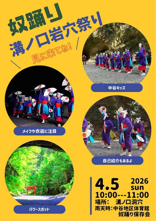 令和8年4月5日(日曜日)に溝ノ口洞穴で行われる岩穴祭りにて、中谷の奴踊り(市指定文化財)が披露されます。中谷小学校の児童の皆さんが継承されている伝統の踊りをぜひご覧ください。