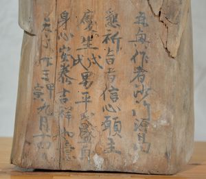 背面には墨書があり、天文23年(1554)再興、願主平盛貞、作者は僧の源昌とあります。平盛貞という人物について詳細は不明ですが、この地域の有力者であったと考えられます。また、僧侶の源昌は、当地域を中心に造像活動をしていた仏師僧と考えられます。