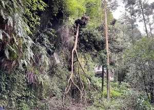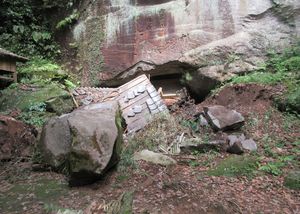 令和2年6月の大雨により、壁面上部から大岩が落下、観音堂や江戸時代の石碑が被災しました。また、令和6年6月の大雨では大規模な倒木が発生しました。再び岩や樹木が落下する恐れもありますので、大雨や強風等の天候不良時には立ち入らないでください。また、見学の際には十分にご注意ください。