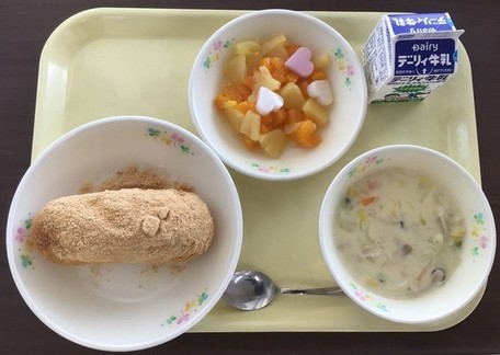 ちょっときな粉盛りすぎですが・・・バレンタインにちなんでハートの杏仁豆腐の入った「バレンタインポンチ」と地元の野菜たっぷりの「冬野菜のクリーム煮」と待望のきなこ揚げパン!みんなが大好きな献立になりました。