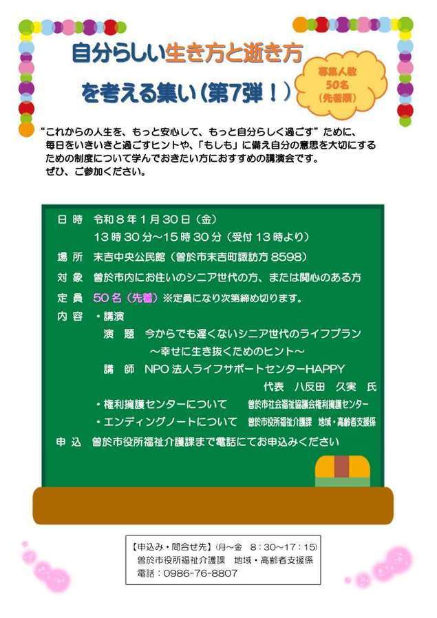 曽於市では、シニア世代の皆さまがこれからの人生を安心して自分らしく過ごすためのヒントを学べる「自分らしい生き方と逝き方を考える集い(第7弾)」を開催します。